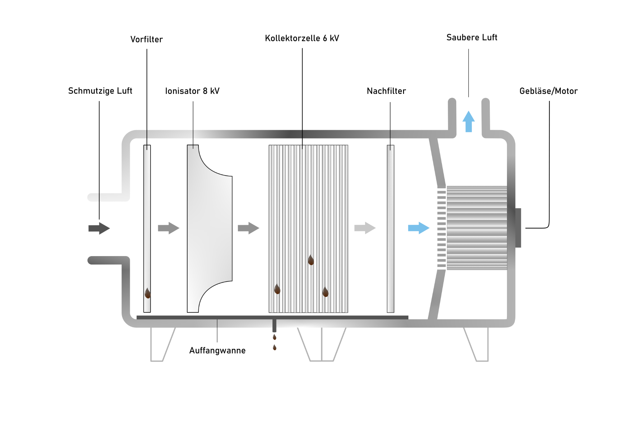 Kollektorzelle – Die elektrisch geladenen Partikel werden durch wechselnde Hochspannungsplatten gezielt aus dem Luftstrom gezogen und an den geerdeten Plattenoberflächen abgesetzt. Die abgeschiedene Flüssigkeit wird gesammelt und kann über einen optionalen Siphon abgeführt werden. So sind Abscheidegrade bis zu 99 % möglich.